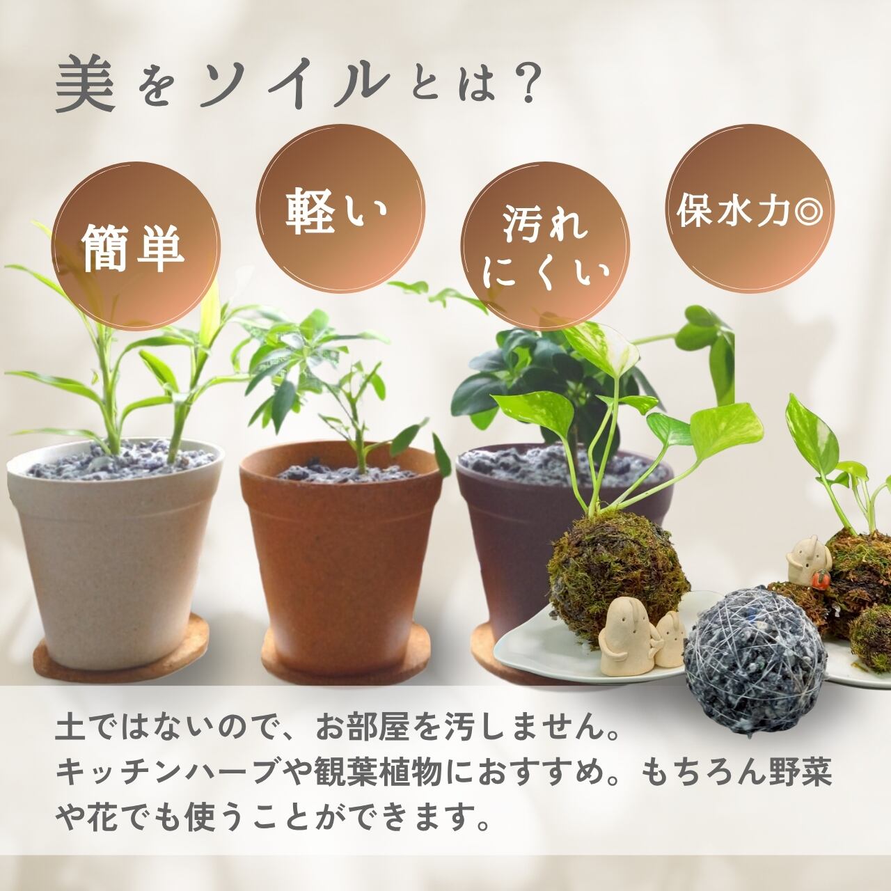 「かんたん」「かるい」「よごれにくい」「バツグンの保水力」が特徴の美をソイル。土ではないので、お部屋を汚しません。キッチンハーブや観葉植物におすすめ。もちろん野菜や花でも使うことができます。