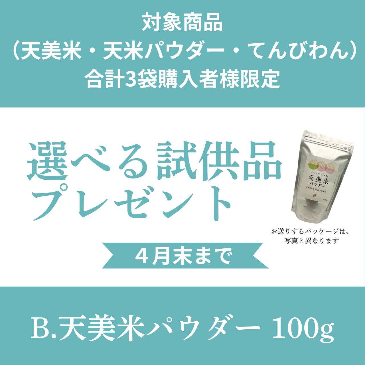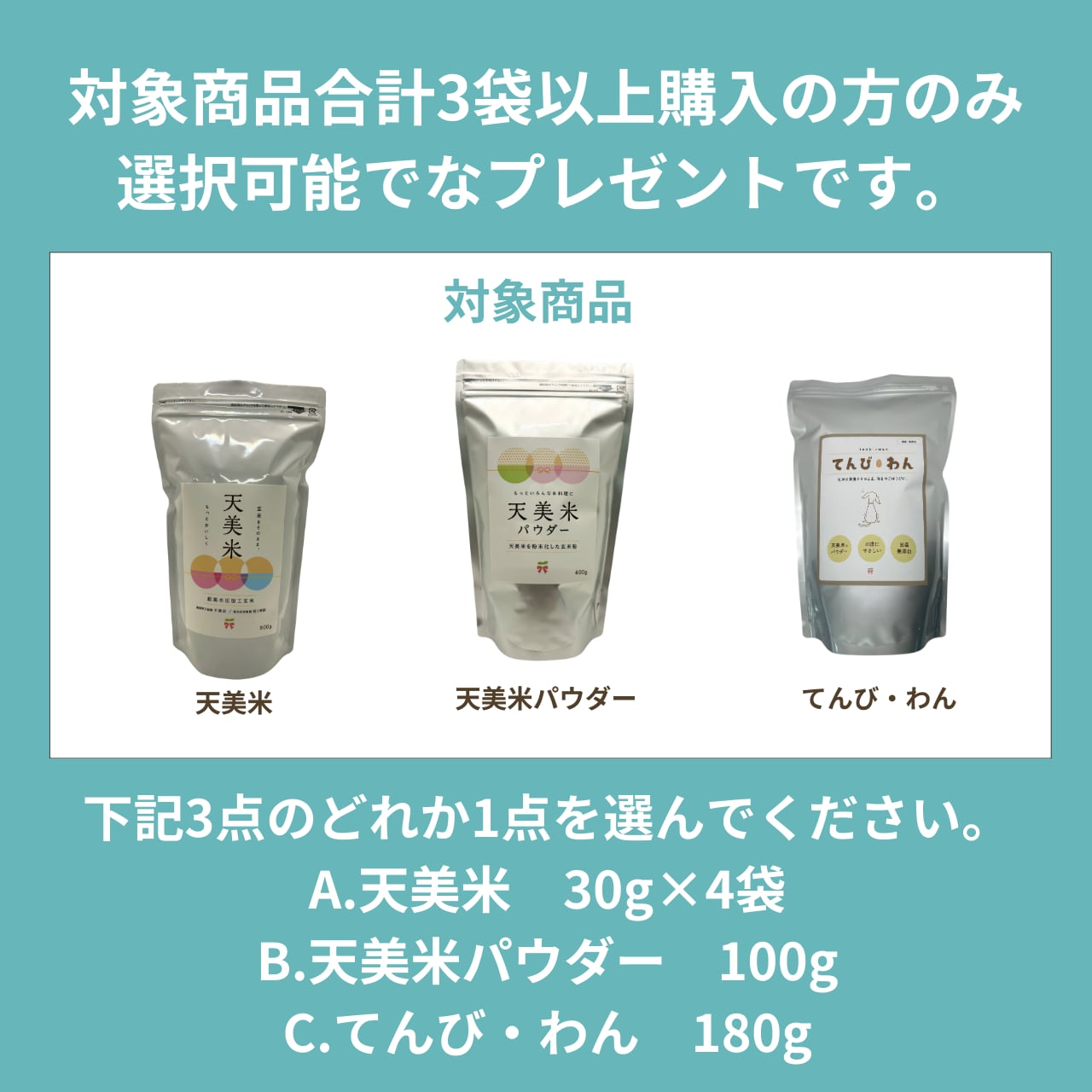 対象商品【天美米】【天美米パウダー】【てんび・わん】を合計3袋購入していただいたお客様限定で無料サンプルをプレゼントさせていただきます。